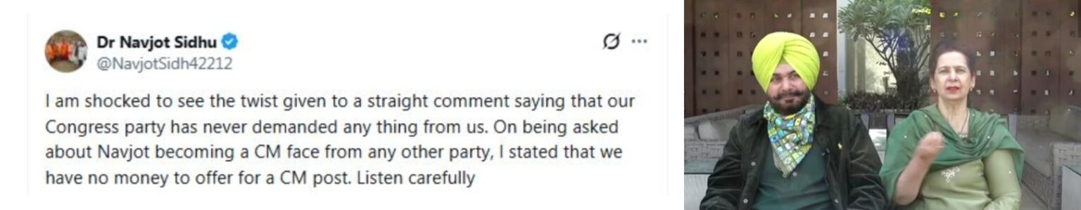 ਡਾਕਟਰ ਨਵਜੋਤ ਕੌਰ ਸਿੱਧੂ ਨੇ ਸੋਸ਼ਲ ਮੀਡੀਆ ਉੱਤੇ ਇੱਕ ਪੋਸਟ ਸਾਂਝੀ ਕੀਤੀ ਹੈ। ਉਸਦੇ ਵਿੱਚ ਉਹਨਾਂ ਨੇ ਲਿਖਿਆ ਹੈ ਕਿ ਉਹਨਾਂ ਨੂੰ ਬਹੁਤ ਹੀ ਹੈਰਾਨੀ ਹੋ ਰਹੀ ਹੈ ਕਿ ਉਹਨਾਂ ਦੇ ਸਿੱਧੇ ਸਾਧੇ ਦਿੱਤੇ ਹੋਏ ਬਿਆਨ ਨੂੰ ਤੋੜ ਮਰੋੜ ਕੇ ਪੇਸ਼ ਕੀਤਾ ਗਿਆ ਹੈ। ਉਹਨਾਂ ਨੇ ਕਿਹਾ ਕਿ ਉਹਨਾਂ ਨੇ ਆਪਣੇ ਬਿਆਨਾਂ ਦੇ ਵਿੱਚ ਕਿਹਾ ਸੀ ਕਿ ਜਦੋਂ ਉਹਨਾਂ ਨੂੰ ਪੁੱਛਿਆ ਗਿਆ ਸੀ ਕਿ ਕੀ ਨਵਜੋਤ ਸਿੱਧੂ ਕਿਸੇ ਹੋਰ ਪਾਰਟੀ ਤੋਂ ਸੀਐਮ ਦਾ ਚਿਹਰਾ ਬਣਨਾ ਚਾਹੁੰਦੇ ਹਨ । ਤਾਂ ਉਹਨ੍ਾਂ ਨੇ ਅੱਗੇ ਕਿਹਾ ਸੀ ਕਿ ਉਹਨਾਂ ਕੋਲ ਸੀਐਮ ਦੇ ਅਹੁਦੇ ਦੇ ਬਦਲੇ ਪੈਸਾ ਦੇਣ ਨੂੰ ਨਹੀਂ ਹੈ। ਅੱਗੇ ਉਹਨਾਂ ਨੇ ਕਿਹਾ ਕਿ ਉਹਨਾਂ ਦੇ ਬਿਆਨ ਨੂੰ ਸਭ ਤੋਂ ਪਹਿਲਾਂ ਧਿਆਨ ਦੇ ਨਾਲ ਸੁਣਨਾ ਚਾਹੀਦਾ ਸੀ।