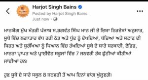 बता दे अब सचूल में 7 तारीख तक छुट्टियों का ऐलान हुआ है। डॉ हरजोत बैंस का कहना है के सभी प्राइवेट और सरकारी स्कूल 7 तारीख तक बंद रहेंगे। ओर 8 तारीख को सभी स्कूल सामान्य रूप से खोले जाएंगे।
