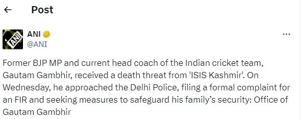 ਸਪੋਰਟ ਕਾਉੰਟਰ -(ਮਨਦੀਪ ਕੌਰ )-ਪਹਿਲਗਾਮ ਵਿਚ ਹੋਏ ਹਮਲੇ ਦੀ ਅੱਗ ਅਜੇ ਠੰਡੀ ਵੀ ਨਹੀਂ ਹੋਈ ਕਿ ਅਜਿਹਾ ਹੀ ਇਕ ਹੋਰ ਗੰਭੀਰ ਮਾਮਲਾ ਸਾਮਣੇ ਆਇਆ ਹੈ I ਜਿਥੇ ਭਾਰਤੀਏ ਕ੍ਰਿਕਟ ਦੇ ਕੋਚ ਗੌਤਮ ਗੰਭੀਰ ਨੂੰ ਜਾਣੋ ਮਾਰਨ ਦੀ ਧਮਕੀ ਮਿਲੀ ਹੈ I