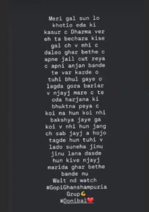 ਹੁਣ, ਗੋਪੀ ਘਣਸ਼ਾਮਪੁਰੀਆ ਗੈਂਗ ਦੀ ਵੀ ਮੈਦਾਨ ਵਿੱਚ ਐਂਟਰੀ ਹੋਈ ਹੈ ਅਤੇ ਸੋਸ਼ਲ ਮੀਡੀਆ ਰਾਹੀਂ ਜੱਗੂ ਭਗਵਾਨਪੁਰੀਆ ਗੈਂਗ ਨੂੰ ਖੁੱਲ੍ਹੀ ਚੇਤਾਵਨੀ ਦਿੱਤੀ ਹੈ। ਉਨ੍ਹਾਂ ਨੇ ਸੋਸ਼ਲ ਮੀਡੀਆ ‘ਤੇ ਲਿਖਿਆ, “ਕੋਈ ਗੱਲ ਨਹੀਂ, ਹੁਣ ਕਿਸੇ ਨੂੰ ਵੀ ਬਖਸ਼ਿਆ ਨਹੀਂ ਜਾਵੇਗਾ, ਕਿਸੇ ਨੂੰ ਵੀ ਨਹੀਂ। ਹੁਣ, ਜੰਗ ਵਿੱਚ ਸਭ ਕੁਝ ਜਾਇਜ਼ ਹੈ। ਹੋ ਜਾਓ ਹੁਣ ਤਗੜੇ ਹੁਣ।”