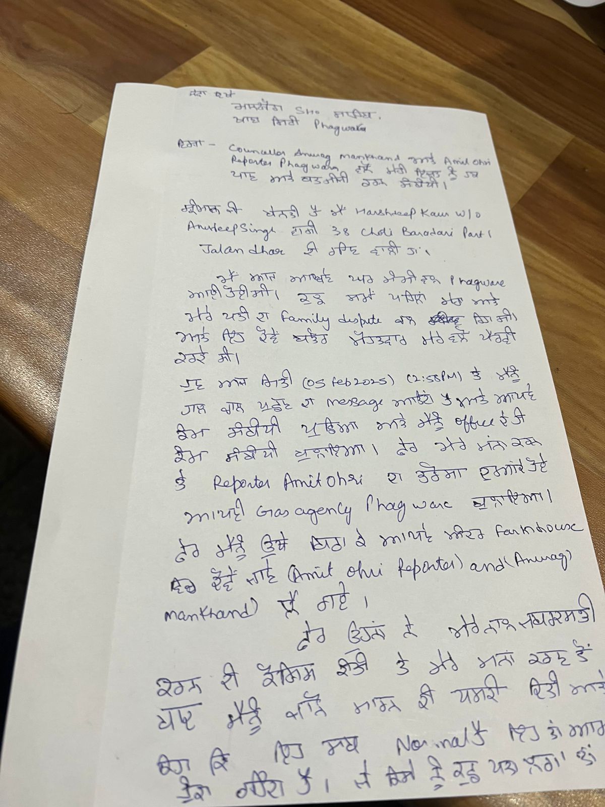ਇਸ ਦੌਰਾਨ ਮੈਨੂੰ ਕੰਮ ਲਈ ਪੁੱਛਿਆ ਗਿਆ। ਅਤੇ ਆਫਿਸ ਦੇ ਵਿਚ ਕੰਮ ਕਰਨ ਵਾਸਤੇ ਬੁਲਾਇਆ ਗਿਆ। ਪਹਿਲੇ ਤਾਂ ਮੈਂ ਮਨਾ ਕਰ ਦਿੱਤਾ। ਫਿਰ ਮੈਨੂੰ ਪੱਤਰਕਾਰ ਅਮਿਤ ਓਹਰੀ ਦਾ ਭਰੋਸਾ ਦਵਾਉਂਦੇ ਹੋਏ ਫਗਵਾੜਾ ਗੈਸ ਏਜੰਸੀ ਦੇ ਵਿੱਚ ਬੁਲਾਇਆ ਗਿਆ। ਜਿੱਥੋਂ ਮੈਨੂੰ ਪੱਤਰਕਾਰ ਅਮਿਤ ਓਰੀ ਅਤੇ ਬੀਜੇਪੀ ਨੇਤਾ ਅਨੁਰਾਗ ਮਾਰਕੰਡ ਆਪਣੇ ਫਾਰਮ ਹਾਊਸ ਵਿੱਚ ਲੈ ਗਏ । ਪੀੜਤਾਂ ਦੇ ਆਰੋਪ ਹਨ ਕਿ ਇਹਨਾਂ ਦੋਵਾਂ ਨੇ ਉੱਥੇ ਉਸ ਨਾਲ ਜ਼ਬਰਦਸਤੀ ਕਰਨ ਦੀ ਕੋਸ਼ਿਸ਼ ਕੀਤੀ। ਪੀੜਤਾਂ ਨੇ ਦੱਸਿਆ ਕਿ ਇਸ ਦੌਰਾਨ ਉਸ ਨੂੰ ਜਾਣ ਤੋਂ ਮਾਰਨ ਦੀ ਧਮਕੀ ਵੀ ਦਿੱਤੀ ਗਈ।