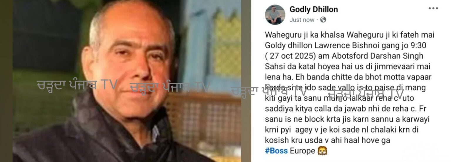 ਲੁਧਿਆਣਾ -(ਮਨਦੀਪ ਕੌਰ )- ਬੀਤੇ ਦਿਨੀ ਕਨੇਡਾ ਦੇ ਵਿੱਚ ਲੁਧਿਆਣਾ ਦੇ ਵੱਡੇ ਕਾਰੋਬਾਰੀ ਦਾ ਗੋਲੀਆਂ ਮਾਰ ਕੇ ਕਤਲ ਕਰ ਦਿੱਤਾ ਗਿਆ ਇਸੇ ਕਤਲ ਦੀ ਜਿੰਮੇਵਾਰੀ ਲੋਰੈਂਸ ਬਿਸ਼ਨੋਈ ਗੈਂਗ ਦੇ ਗੋਲਡੀ ਢਿੱਲੋ ਨੇ ਇੱਕ ਸੋਸ਼ਲ ਮੀਡੀਆ ਉੱਤੇ ਪੋਸਟ ਸਾਂਝੀ ਕਰਕੇ ਲਈ ਹੈ ।