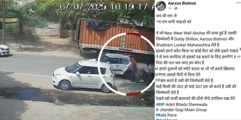 ਅਬੋਹਰ -(ਮਨਦੀਪ ਕੌਰ )- ਅੱਜ ਸਵੇਰੇ new wear well ਸ਼ੋ ਰੂਮ ਦੇ ਮਾਲਿਕ ਦਾ ਗੋਲੀਆਂ ਮਾਰ ਕੇ ਕਤਲ ਕਰ ਦਿੱਤਾ ਗਿਆ । ਜਿਸ ਤੋਂ ਬਾਅਦ ਹੁਣ ਇੱਕ ਨਵੀਂ ਅਪਡੇਟ ਸਾਮ੍ਹਣੇ ਆਈ ਹੈ । ਇਸ ਕਤਲ ਦੀ ਜਿੰਮੇਵਾਰੀ ਲਾਰੈਂਸ ਗੈਂਗ ਵਲੋਂ ਲਈ ਗਈ ਹੈ। ਸੰਜੇ ਵਰਮਾ ਦੇ ਕਤਲ ਤੋਂ ਬਾਅਦ ਆਰਜ਼ੂ ਬਿਸ਼ਨੋਈ ਦੇ ਨਾਮ ਤੋਂ ਇੱਕ ਪੋਸਟ ਸਾਂਝੀ ਕੀਤੀ ਗਈ ਹੈ ।