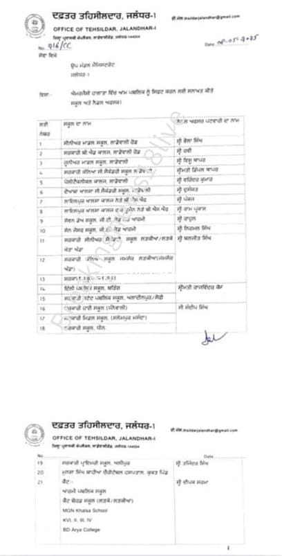 ਇਸ ਲਈ ਇਕ ਲਿਸਟ ਜਲੰਧਰ ਪ੍ਰਸ਼ਾਸ਼ਨ ਵਲੋ ਜਾਰੀ ਕੀਤੀ ਗਈ ਹੈ । ਇਸ ਲਿਸਟ ਵਿਚ ਜਿਆਦਾਤਰ ਸਰਕਾਰੀ ਅਤੇ ਨਿੱਜੀ ਸਕੂਲ ,ਅਤੇ ਕਾਲਜ ਸ਼ਾਮਿਲ ਹਨ । ਇਸ ਲਈ ਹਰ ਜਗ੍ਹਾ ਮਾਡਲ ਆਫਸਰ ਵੀ ਨਿਯੁਕਤ ਕੀਤੇ ਗਏ ਹਨ ।